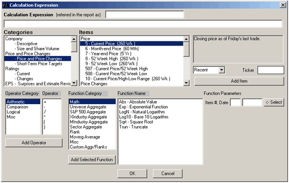 4. In the Categories Window, select Price and Price Changes. And in the Items Window, select Current Price. (Shown below.) (Notice next to Current Price, it has (260 Wk) in parentheses. That means there's 260 weeks worth of data points to choose from.)
