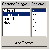 7. Then in the lower left corner, go to the Operator Category window and select Comparison. In the Operator window to the right of it, select the ' > ' sign. Then click Add Operator when done. (See below.)
