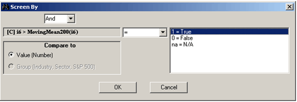 In this example: let's screen for stocks trading above their 200 day moving average.